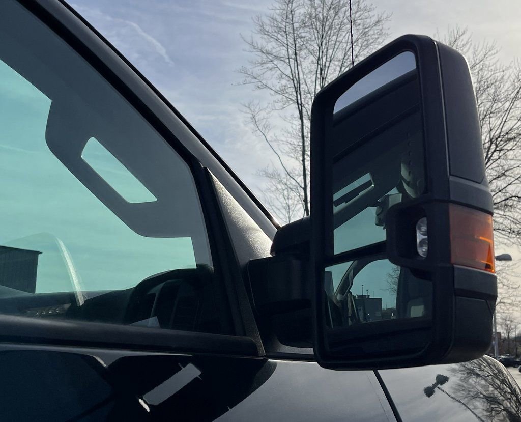 - MIRRORS OUTSIDE HEATED POWER-ADJUSTABLE VERTICAL TRAILERING UPPER GLASS MANUAL-FOLDING AND EXTENDING BLACK. Includes integrated turn signal indicators consisting of 51 square inch flat mirror surface positioned over a 24.5 square inch convex mirror surface with a common head and lower convex spotter glass (convex glass is not heated and not power adjustable) and addition of Auxiliary cargo lamp for backing up (helps to see trailer when backing up with a trailer) and amber auxiliary clearance lamp