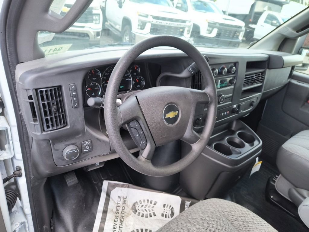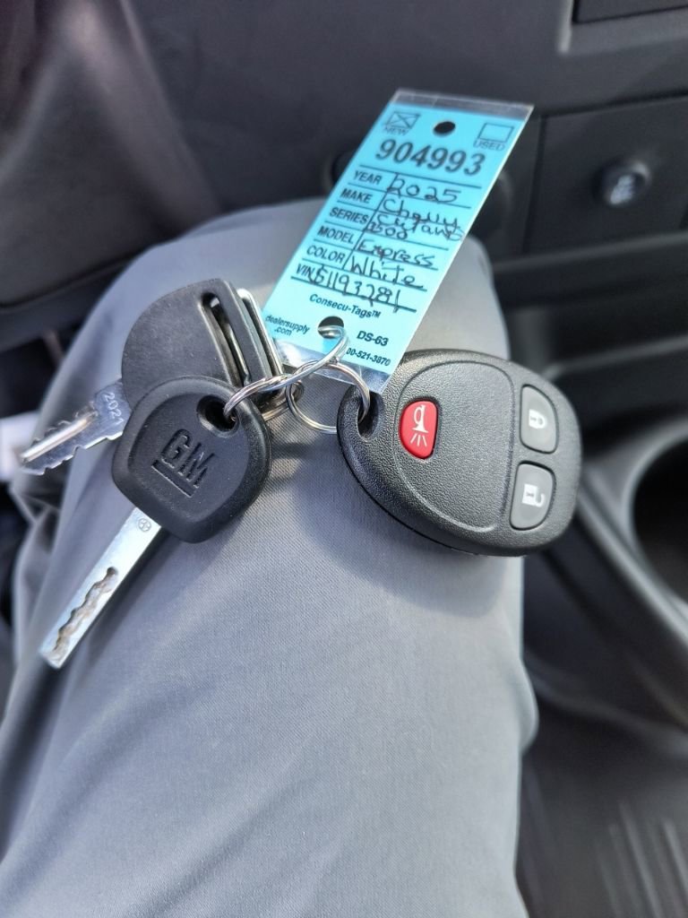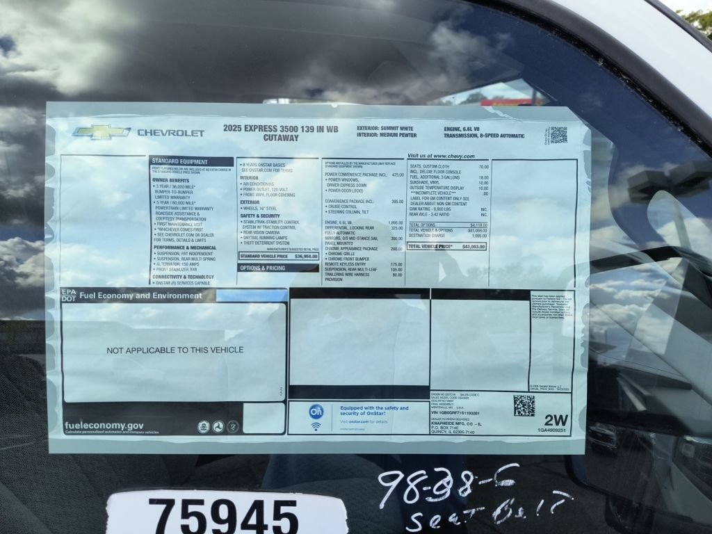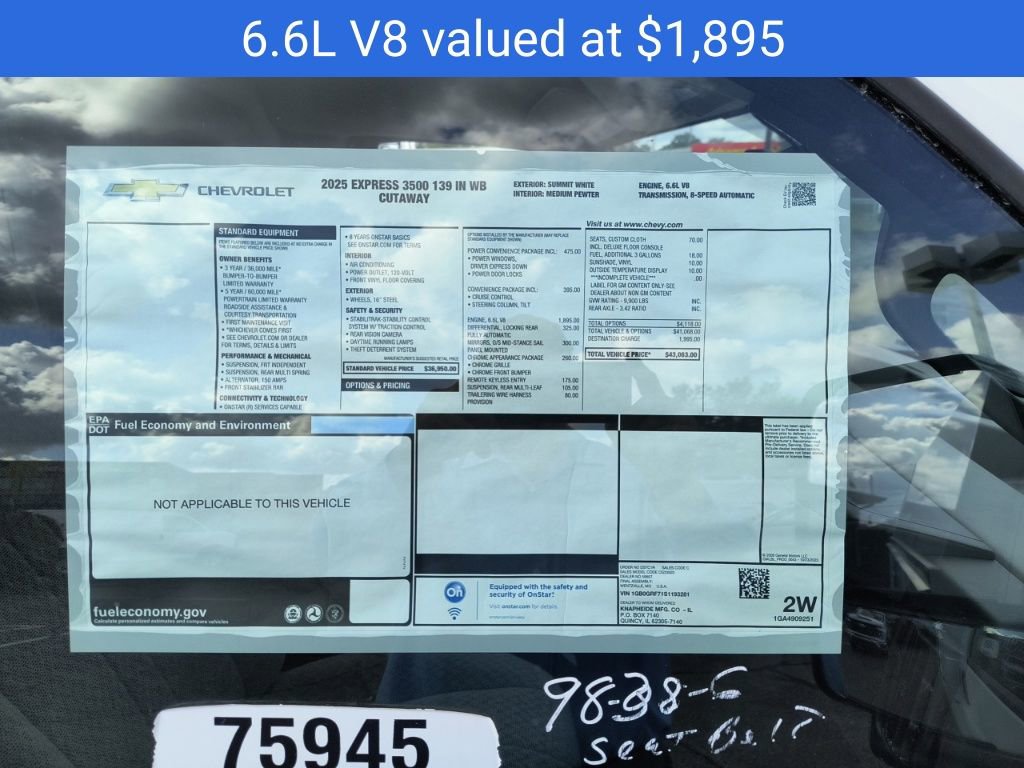 Summit White 2025 Chevrolet Express 3500 Work Van Cutaway RWD 8-Speed Automatic 6.6L V8 2 Speakers, 3.42 Rear Axle Ratio, 4-Wheel Disc Brakes, ABS brakes, Air Conditioning, AM/FM radio, Chrome Appearance Package, Chrome Grille, Cruise Control, Delay-off headlights, Driver & Front Passenger High-Back Bucket Seats, Driver & Front Passenger Vinyl Visors, Driver Convenience Package, Driver door bin, Driver's Seat Mounted Armrest, Dual front impact airbags, Dual front side impact airbags, Electronic Stability Control, Engine Cover Console w/Swing-Out Storage Bin, Exterior Parking Camera Rear, Front anti-roll bar, Front Bucket Seats, Front Chrome Bumper w/Step-Pad, Front wheel independent suspension, Fully automatic headlights, Heavy-Duty Locking Rear Differential, Inside Rearview Mirror w/Rr Vision Camera Display, Low tire pressure warning, Occupant sensing airbag, Outside Temperature Display, Overhead airbag, Passenger cancellable airbag, Passenger door bin, Passenger seat mounted armrest, Power Convenience Package, Power Door Locks w/Lock-Out Protection, Power steering, Power Windows, Preferred Equipment Group 1WT, Radio: AM/FM Stereo w/MP3 Player & Digital Clock, Reclining High-Back Bucket Seats w/Inboard Armrests, Remote Keyless Entry, Single Rear Wheel Configuration, Tachometer, Theft Alarm Notification, Tilt Steering Wheel, Traction control, Trailering Wire Harness, Trip computer, Variably intermittent wipers, Vinyl Seat Trim, Voltmeter, Wheels: 16 x 6.5 8-Lug Painted Steel HD (4).