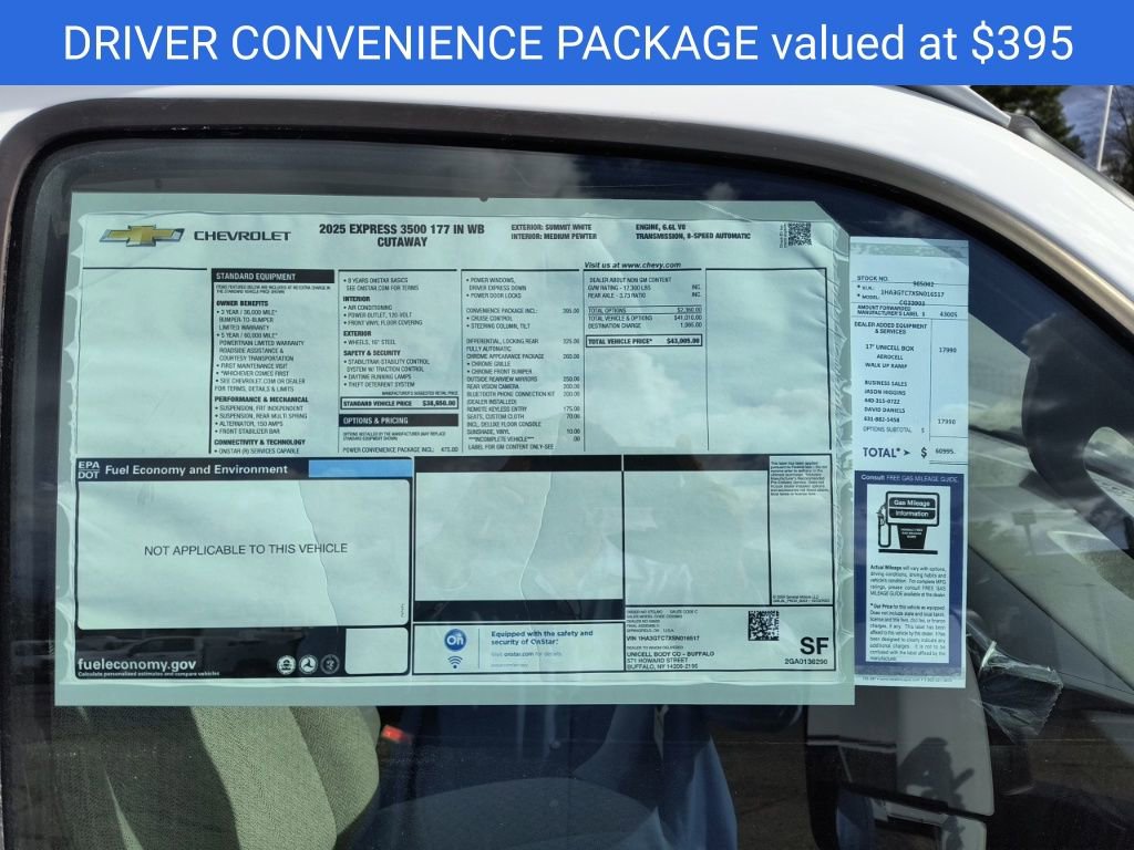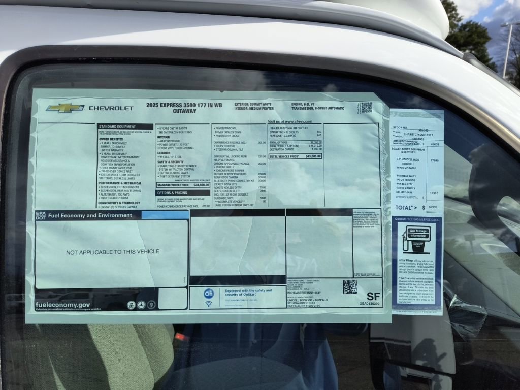 Summit White 2025 Chevrolet Express 3500 Work Van Cutaway 17' Box Truck RWD 8-Speed Automatic 6.6L V8 2 Speakers, 3.73 Rear Axle Ratio, 4-Wheel Disc Brakes, ABS brakes, Air Conditioning, AM/FM radio, Bluetooth Phone Connection Kit (LPO), Chrome Appearance Package, Chrome Grille, Cruise Control, Delay-off headlights, Driver & Front Passenger High-Back Bucket Seats, Driver & Front Passenger Vinyl Visors, Driver Convenience Package, Driver door bin, Driver's Seat Mounted Armrest, Dual front impact airbags, Dual Rear Wheel Configuration, Dual rear wheels, Electronic Stability Control, Engine Cover Console w/Swing-Out Storage Bin, Front anti-roll bar, Front Bucket Seats, Front Chrome Bumper w/Step-Pad, Front wheel independent suspension, Fully automatic headlights, Heavy-Duty Locking Rear Differential, Inside Rearview Mirror w/Rr Vision Camera Display, Manual Day/Night Inside Rear-View Mirror, Occupant sensing airbag, Passenger cancellable airbag, Passenger door bin, Passenger seat mounted armrest, Power Convenience Package, Power Door Locks w/Lock-Out Protection, Power steering, Power Windows, Preferred Equipment Group 1WT, Radio: AM/FM Stereo w/MP3 Player & Digital Clock, Rear Vision Camera, Reclining High-Back Bucket Seats w/Inboard Armrests, Remote Keyless Entry, Tachometer, Theft Alarm Notification, Tilt Steering Wheel, Traction control, Trip computer, Variably intermittent wipers, Vinyl Seat Trim, Voltmeter, Wheels: 16 x 6.5 8-Lug Painted Steel HD (6), Wide-Stance Sail Panel Mounted Outside Mirrors.