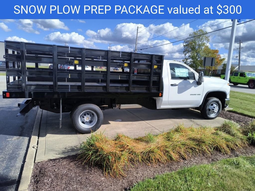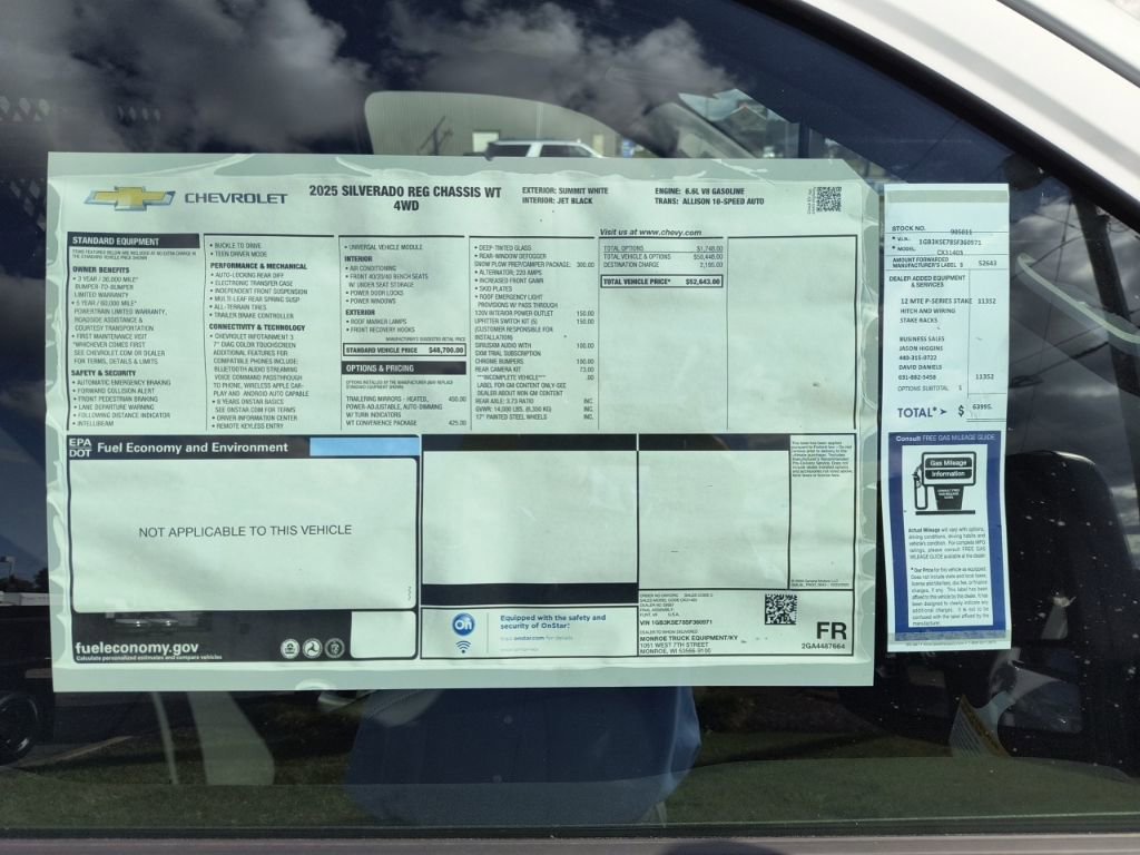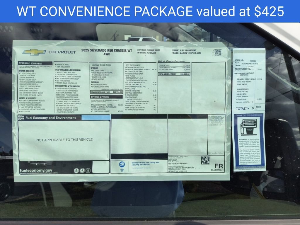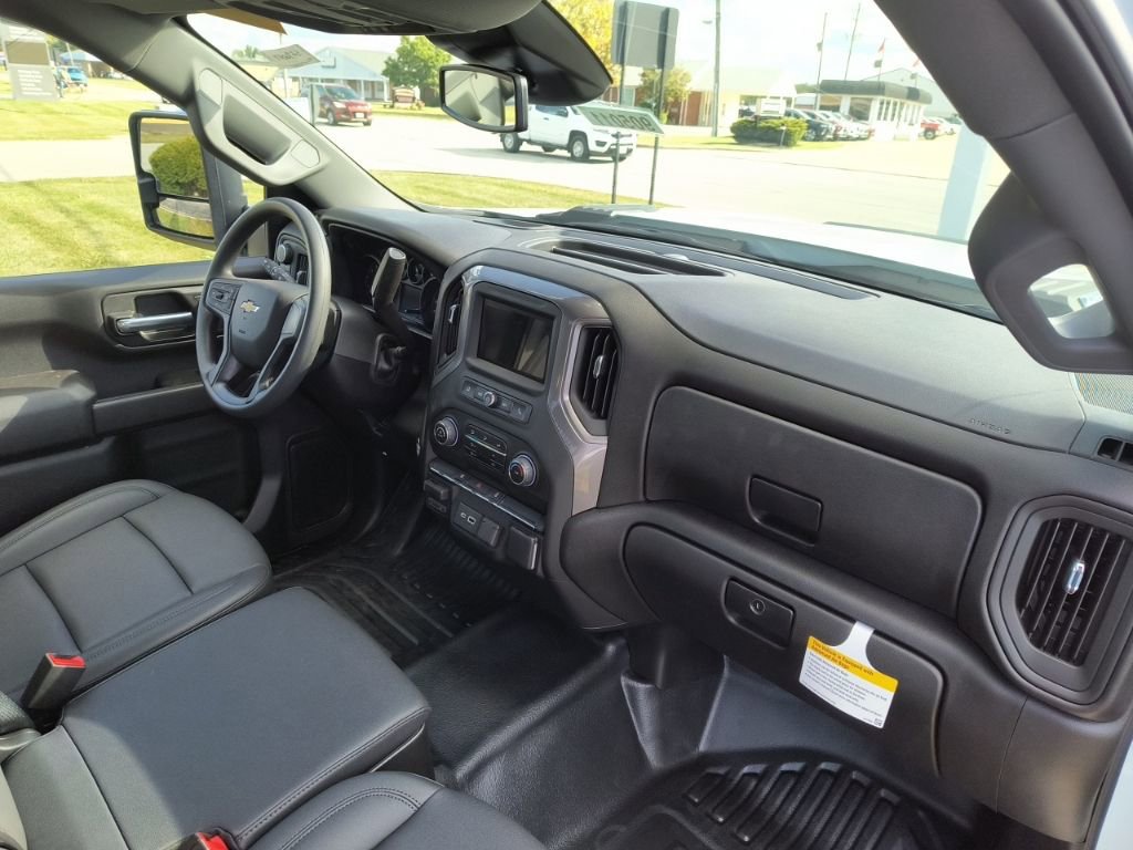 Summit White 2025 Chevrolet Silverado 3500HD Work Truck 4WD 10-Speed Automatic 6.6L V8 10-Speed Automatic, 4WD, Jet Black Vinyl, 120-Volt (400 Watts) Interior Power Outlet, 17 Painted Steel Wheels, 170 Amp Alternator, 18 Painted Steel Wheels, 2 Speakers, 2-Speaker Audio System Feature, 2-Speed Electronic Shift Transfer Case, 220 Amp Alternator, 3.5 Diagonal Monochromatic Display DIC, 3.73 Rear Axle Ratio, 4-Way Manual Driver Seat Adjuster, 4-Way Manual Passenger Seat Adjuster, 4-Wheel Disc Brakes, ABS brakes, Air Conditioning, AM/FM radio, Auto High-beam Headlights, Auto-Dimming Inside Rear-View Mirror, Black Front Bumper, Black Mirror Caps, Bluetooth For Phone, Brake assist, Compass, Compass Located In Instrument Cluster, Deep-Tinted Glass, Delay-off headlights, Driver door bin, Dual front impact airbags, Dual front side impact airbags, Dual rear wheels, Electric Rear-Window Defogger, Electronic Stability Control, Front 40/20/40 Split-Bench Seat, Front anti-roll bar, Front Center Armrest w/Storage, Front Chrome Bumper, Front Grille Bar w/Black Mesh Inserts, Front License Plate Kit, Front reading lights, Front wheel independent suspension, Fully automatic headlights, Heavy-Duty 80 Amp-Hr Battery, Illuminated entry, Low tire pressure warning, Manual Tilt Inside Rearview Mirror, Manual Tilt-Wheel Steering Column, Occupant sensing airbag, OnStar Services Capable, Outside temperature display, Overhead airbag, Overhead console, Panic alarm, Passenger door bin, Passenger vanity mirror, Power steering, Power windows, Power-Adjustable Outside Mirrors, Preferred Equipment Group 1WT, Radio: Chevrolet Infotainment 3 System, Remote keyless entry, Rubberized-Vinyl Floor Covering, SiriusXM Trial Subscription, Snow Plow Prep Package, Solar Absorbing Tinted Glass, Speed control, Steering Wheel Mounted Electronic Cruise Control, Suspension Package, Tachometer, Tilt steering wheel, Traction control, Trip computer, Upfitter Switch Kit (5), Variably intermittent wipers, Vinyl Seat Trim, Voltmeter, WT Convenience Package, 10-Speed Automatic, 4WD, Jet Black Vinyl.