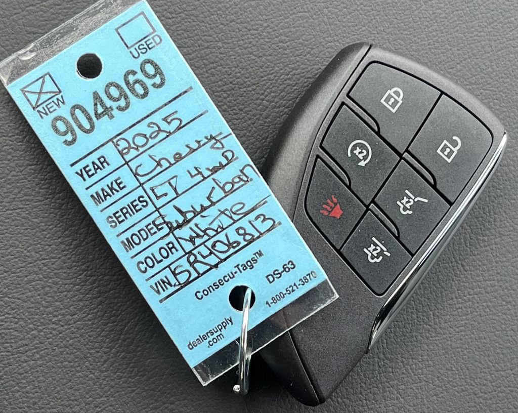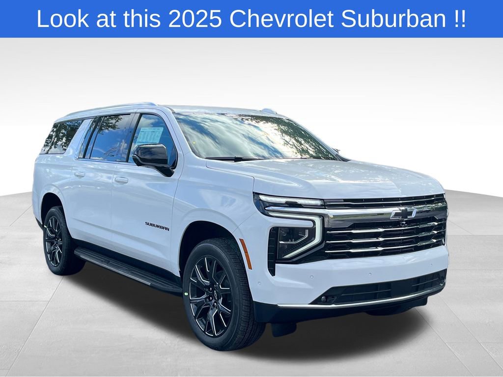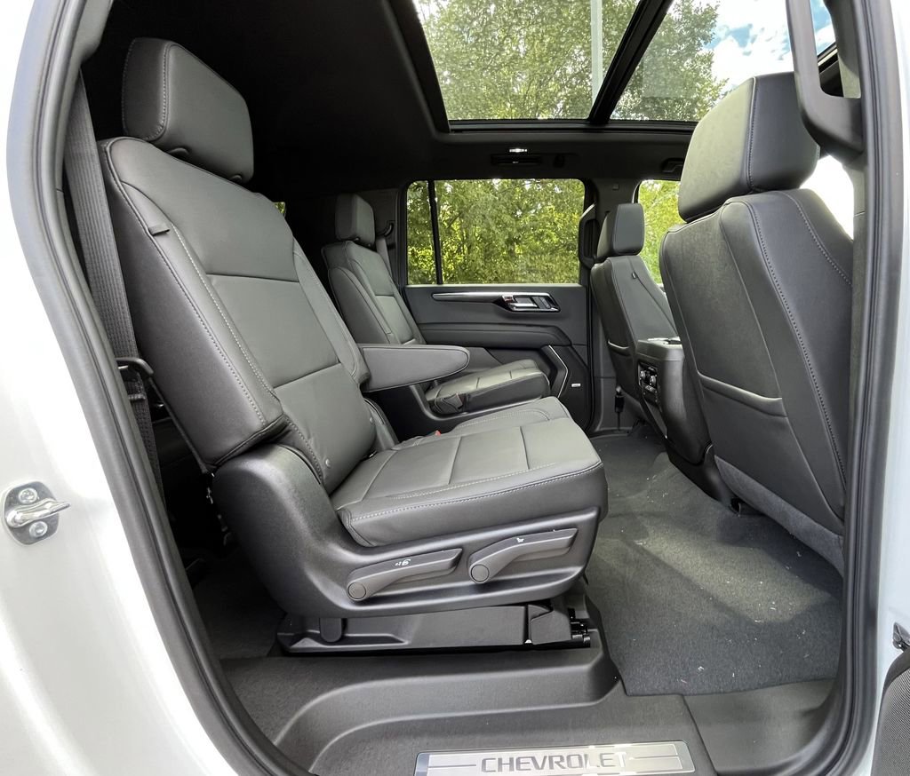 Summit White 2025 Chevrolet Suburban LT 4WD 10-Speed Automatic with Overdrive EcoTec3 5.3L V8 15 Diagonal Multi-Color Head-Up Display, 2 USB Charge/Data Ports in Center Console Delete, 2-Speed Active Electronic AutoTrac Transfer Case, 2-Way Driver Power Lumbar Seat Adjuster, 2-Way Front Passenger Power Lumbar Seat Adjuster, 2nd Row Power Release 60/40 Split-Folding Bench Seat, 3 Years of OnStar Services/Safety Services, 3.23 Rear Axle Ratio, 3rd Row 60/40 Power-Folding Split-Bench, 3rd row seats: split-bench, 4-Wheel Disc Brakes, 6 Speakers, 6-Speaker Audio System, 8-Way Power Driver Seat Adjuster, 8-Way Power Front Passenger Seat Adjuster, ABS brakes, Advanced Technology Package, Advanced Trailering Package, Air Conditioning, Alloy wheels, AM/FM radio: SiriusXM with 360L, Apple CarPlay/Android Auto, Auto High-beam Headlights, Auto-Dimming Inside Rear-View Mirror, Automatic temperature control, Black Mirror Caps, Black Name Plates, Blind Zone Steering Assist with Trailering, Bose 10-Speaker Surround with CenterPoint, Brake assist, Bumpers: body-color, Comfort Package, Compass, Dark Essentials Package, Delay-off headlights, Driver door bin, Driver vanity mirror, Dual front impact airbags, Dual front side impact airbags, Dual-Pane Power Panoramic Sunroof, Electronic Stability Control, Emergency communication system: OnStar Services capable, Exterior Parking Camera Rear, Extra Capacity Cooling System, Four wheel independent suspension, Front and Rear Black Bowtie Emblems, Front anti-roll bar, Front Bucket Seats, Front Center Armrest, Front dual zone A/C, Front LED Fog Lamps, Front reading lights, Fully automatic headlights, Heated 2nd Row Outboard Seats, Heated door mirrors, Heated Driver and Front Passenger Seats, Heated front seats, Heated Power-Adjustable Outside Mirrors, Heated Steering Wheel, Hill Descent Control, Hitch View with Pan/Zoom Image Adjustment, Illuminated entry, Inside Rearview Auo-Dimming Rear Camera Mirror, Integrated Trailer Brake Controller, Leather-Appointed Seating, LED Headlamps with LED Daytime Running Lamps, LED Tail Lamps, Low tire pressure warning, Luxury Package, Max Trailering Package, Memory seat, Memory Settings, Memory Settings For Driver, Navigation system: Google built-in compatibility (select service plan required, terms and limitations apply), Occupant sensing airbag, Outside temperature display, Overhead airbag, Overhead console, Panic alarm, Passenger door bin, Passenger vanity mirror, Power door mirrors, Power driver seat, Power Liftgate, Power passenger seat, Power Release 2nd Row Bucket Seats, Power steering, Power windows, Power-Sliding Center Floor Console, Preferred Equipment Group 1LT, Premium Smooth Ride Suspension, Radio data system, Radio: 17.7 Diagonal Advanced Color LCD Display, Rain sensing wipers, Rear air conditioning, Rear anti-roll bar, Rear Power Liftgate, Rear reading lights, Rear seat center armrest, Rear window defroster, Rear window wiper, Remote keyless entry, Security system, SiriusXM with 360L Trial Subscription, Smart Trailer Integration Indicator, Speed control, Speed-sensing steering, Split folding rear seat, Spoiler, Steering wheel mounted audio controls, Super Cruise, Tachometer, Technology Package, Telescoping steering wheel, Tilt steering wheel, Traction control, Trip computer, Universal Home Remote, Variably intermittent wipers, Voltmeter, Wheel Locks (set of 4), Wheels: 18 x 8.5 Bright Silver Painted Aluminum, Wheels: 22 x 9 6-Spoke Carbon Flash Metallic Aluminum, Wireless Apple CarPlay/Wireless Android Auto, Wireless Phone Charging.