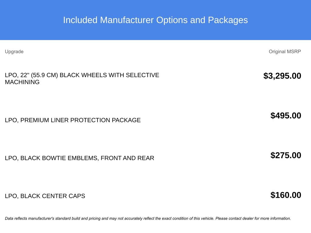 - LPO 22 (55.9 CM) BLACK WHEELS WITH SELECTIVE MACHINING LPO wheels will come with 4 steel 22 wheels from the factory with alignment specs set to 22 LPO wheel selected (dealer-installed) Includes wheel locks and not (SFE) wheel locks LPO.