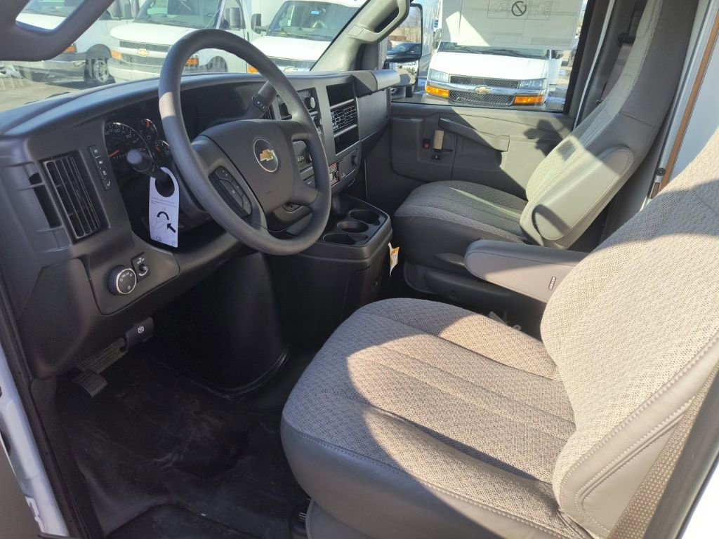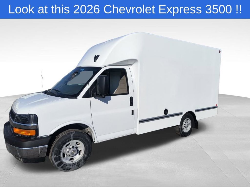 Summit White 2026 Chevrolet Express 3500 Work Van Cutaway RWD 8-Speed Automatic 6.6L V8 2 Speakers, 3.42 Rear Axle Ratio, 4-Wheel Disc Brakes, ABS brakes, Air Conditioning, AM/FM radio, Bluetooth Phone Connection Kit, Chrome Appearance Package, Chrome Grille, Cruise Control, Delay-off headlights, Driver and Front Passenger High-Back Bucket Seats, Driver and Front Passenger Vinyl Visors, Driver Convenience Package, Driver door bin, Driver's Seat Mounted Armrest, Dual front impact airbags, Dual front side impact airbags, Electronic Stability Control, Emergency communication system, Engine Cover Console with Swing-Out Storage Bin, Exterior Parking Camera Rear, Front anti-roll bar, Front Bucket Seats, Front Chrome Bumper with Step-Pad, Front wheel independent suspension, Fully automatic headlights, Heavy-Duty Locking Rear Differential, Inside Rearview Mirror with Rear Vision Camera Display, Low tire pressure warning, Occupant sensing airbag, Overhead airbag, Passenger cancellable airbag, Passenger door bin, Passenger seat mounted armrest, Power Convenience Package, Power Door Locks with Lock-Out Protection, Power steering, Power Windows, Preferred Equipment Group 1WT, Radio: AM/FM Stereo with MP3 Player and Digital Clock, Reclining High-Back Bucket Seats with Inboard Armrests, Remote Keyless Entry, Single Rear Wheel Configuration, Tachometer, Theft Alarm Notification, Tilt Steering Wheel, Traction control, Trip computer, Variably intermittent wipers, Vinyl Seat Trim, Voltmeter.
