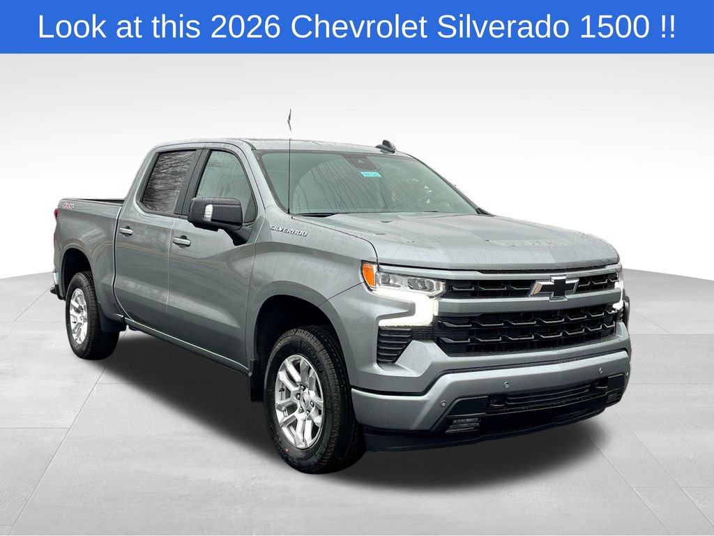 Sterling Gray Metallic 2026 Chevrolet Silverado 1500 RST 4WD 10-Speed Automatic EcoTec3 5.3L V8 10-Speed Automatic, 4WD, Jet Black Cloth, 10-Way Power Driver Seat w/Lumbar, 12.3 Multicolor Reconfigurable Digital Display, 120-Volt Bed Mounted Power Outlet, 120-Volt Interior Power Outlet, 170 Amp Alternator, 2 USB Data Ports, 220 Amp Alternator, 3.23 Rear Axle Ratio, 4-Wheel Disc Brakes, 40/20/40 Front Split-Bench Seat, 6 Speakers, 6-Speaker Audio System, ABS brakes, Air Conditioning, All-Star Edition, All-Weather Floor Liner (LPO), Alloy wheels, AM/FM radio: SiriusXM with 360L, Apple CarPlay/Android Auto, Auto High-beam Headlights, Auto-Locking Rear Differential, Automatic Emergency Braking, Automatic temperature control, Auxiliary External Transmission Oil Cooler, Bluetooth For Phone, Brake assist, Bumpers: body-color, Chevytec Spray-On Black Bedliner, Cloth Seat Trim, Color-Keyed Carpeting Floor Covering, Compass, Convenience Package, Convenience Package II, Deep-Tinted Glass, Delay-off headlights, Driver door bin, Driver vanity mirror, Dual front impact airbags, Dual front side impact airbags, Dual Rear USB Ports (Charge Only), Dual-Zone Automatic Climate Control, Electric Rear-Window Defogger, Electronic Cruise Control, Electronic Stability Control, Electronic Transmission Range Selector Shifter, Emergency communication system: OnStar, External Engine Oil Cooler, EZ Lift Power Lock & Release Tailgate, Floor Mounted Center Console, Following Distance Indicator, Forward Collision Alert, Front anti-roll bar, Front Bucket Seats, Front Center Armrest w/Storage, Front dual zone A/C, Front fog lights, Front Frame-Mounted Black Recovery Hooks, Front LED Fog Lamps, Front Pedestrian Braking, Front reading lights, Front Rubberized Vinyl Floor Mats, Front wheel independent suspension, Fully automatic headlights, HD Rear Vision Camera, HD Surround Vision, Heated door mirrors, Heated Driver & Front Outboard Passenger Seats, Heated front seats, Heated Power-Adjustable Outside Mirrors, Heated Steering Wheel, Heated steering wheel, High Gloss Black Mirror Caps, Hitch Guidance, Hitch Guidance w/Hitch View, Illuminated entry, In-Vehicle Trailering System App, Inside Rear-View Mirror w/Tilt, Integrated Trailer Brake Controller, IntelliBeam Automatic High Beam On/Off, Keyless Open & Start, Lane Keep Assist w/Lane Departure Warning, LED Cargo Area Lighting, Low tire pressure warning, Manual Tilt/Telescoping Steering Column, Occupant sensing airbag, OnStar Services Capable, Outside temperature display, Overhead airbag, Overhead console, Panic alarm, Passenger door bin, Passenger vanity mirror, Perimeter Lighting, Power door mirrors, Power driver seat, Power Front Windows w/Driver Express Up/Down, Power Front Windows w/Passenger Express Down, Power Rear Windows w/Express Down, Power Sliding Rear Window w/Rear Defogger, Power steering, Power windows, Preferred Equipment Group 1SP, Premium audio system: Chevrolet Infotainment 3 Premium, Premium Bose 7-Speaker Sound System, Protection Package, Radio data system, Radio: Chevrolet Infotainment 3 Premium System, Rear 60/40 Folding Bench Seat (Folds Up), Rear Cross Traffic Braking, Rear Pedestrian Alert, Rear reading lights, Rear Rubberized-Vinyl Floor Mats, Rear step bumper, Rear Wheelhouse Liners, Rear window defroster, Remote keyless entry, Remote Vehicle Starter System, Safety Package, Security system, Single Outlet Exhaust, SiriusXM w/360L Trial Subscription, Speed control, Speed-sensing steering, Split folding rear seat, Standard Suspension Package, Standard Tailgate, Steering Wheel Audio Controls, Steering wheel mounted audio controls, Tachometer, Teen Driver, Telescoping steering wheel, Theft Deterrent System (Unauthorized Entry), Tilt steering wheel, Tire Pressure Monitoring System, Traction control, Trailer Camera Provisions, Trailer Side Blind Zone Alert, Trailering Package, Trip computer, Ultrasonic Front & Rear Park Assist, Universal Home Price includes $3,998 dealer added accessories.
