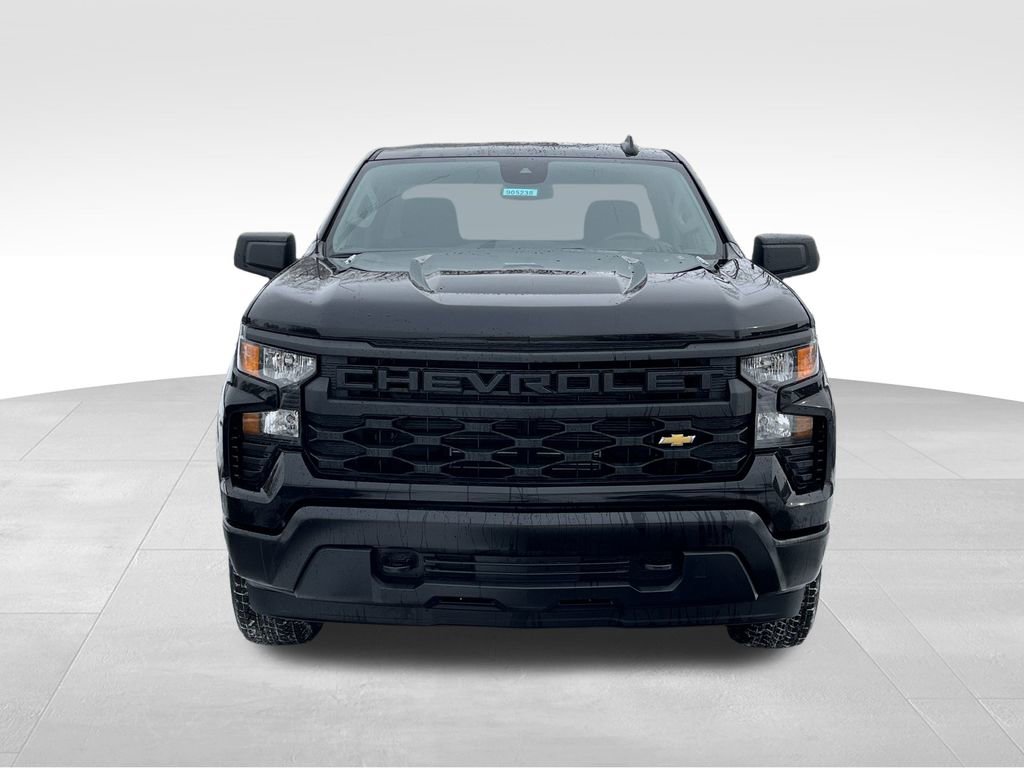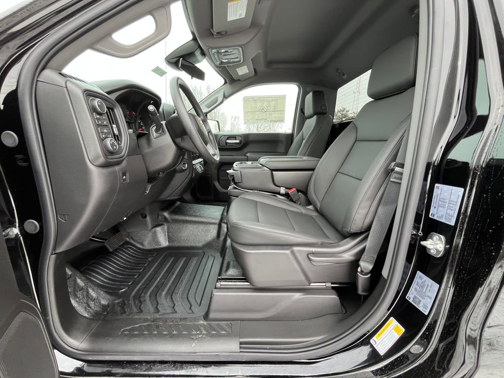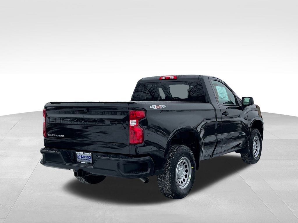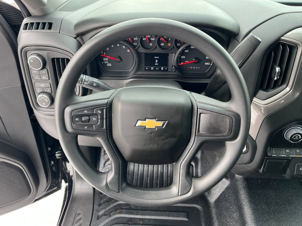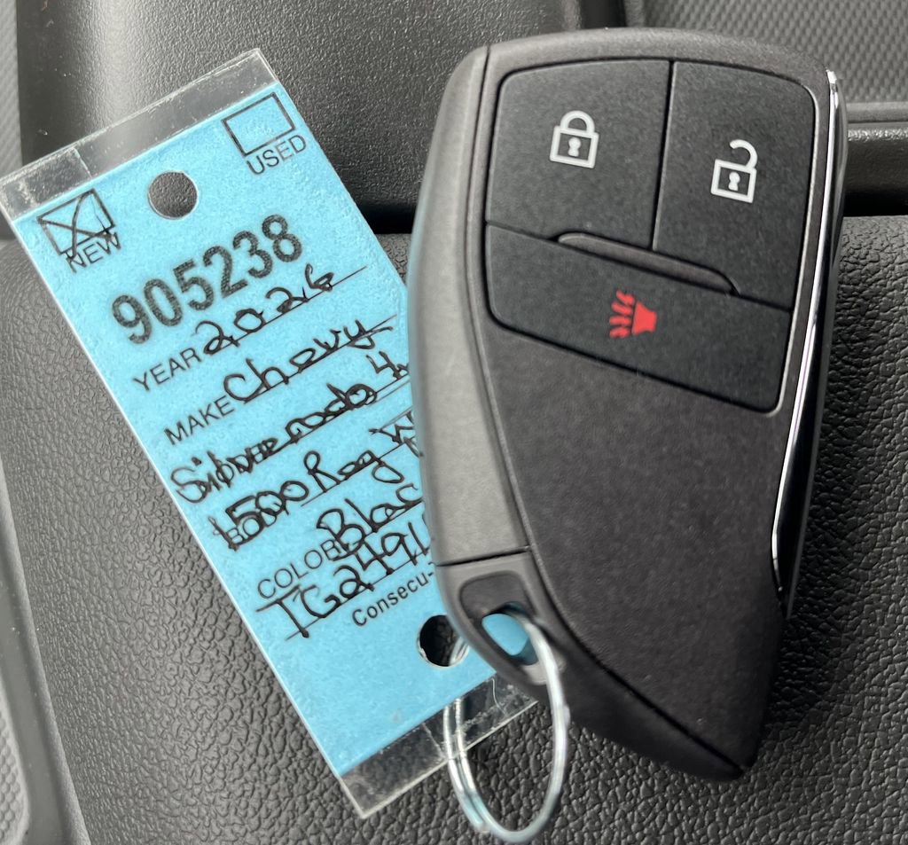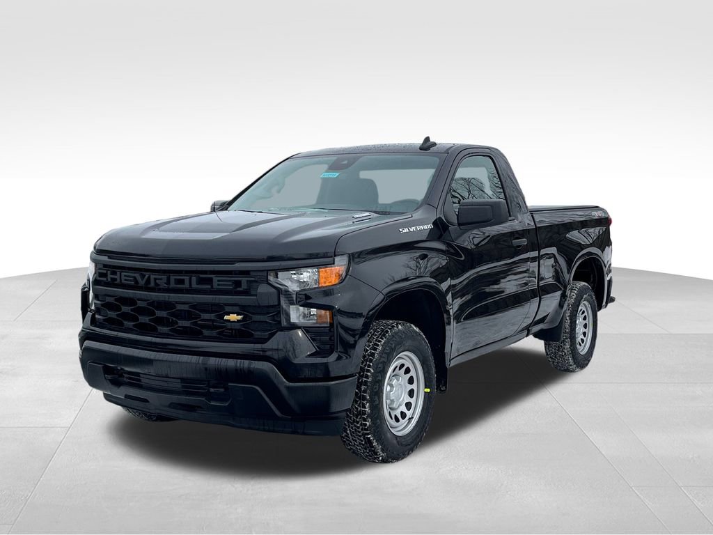Black 2026 Chevrolet Silverado 1500 WT 4WD 8-Speed Automatic 2.7L I4 Turbocharged DOHC 16V LEV3-SULEV30 310hp 8-Speed Automatic, 4WD, Vinyl, 2 Speakers, 2-Speaker Audio System, 220 Amp Alternator, 3.42 Rear Axle Ratio, 3.5 Monochromatic Display Driver Info Center, 4-Way Manual Driver Seat Adjuster, 4-Wheel Disc Brakes, 40/20/40 Front Split Bench Seat, ABS brakes, Air Conditioning, AM/FM radio, Apple CarPlay/Android Auto, Auto High-beam Headlights, Automatic Emergency Braking, Black (Semi-Gloss) Front Bumper, Black (Semi-Gloss) Rear Bumper, Bluetooth For Phone, Brake assist, Compass, Delay-off headlights, Driver door bin, Dual front impact airbags, Dual front side impact airbags, Electronic Cruise Control, Electronic Stability Control, Emergency communication system: OnStar, Following Distance Indicator, Forward Collision Alert, Front anti-roll bar, Front Center Armrest w/Storage, Front Frame-Mounted Black Recovery Hooks, Front Pedestrian Braking, Front reading lights, Front wheel independent suspension, Fully automatic headlights, HD Rear Vision Camera, Heated door mirrors, Heated Power-Adjustable Outside Mirrors, Illuminated entry, Inside Rearview Mirror with Tilt, IntelliBeam Automatic High Beam on/Off, Lane Keep Assist with Lane Departure Warning, Locking Tailgate, Low tire pressure warning, Manual Tailgate Function with No EZ Lift, Manual Tilt Wheel Steering Column, Occupant sensing airbag, OnStar Services Capable, Outside temperature display, Overhead airbag, Overhead console, Panic alarm, Passenger door bin, Passenger vanity mirror, Power door mirrors, Power Front Windows with Driver Express Up/Down, Power steering, Power windows, Premium audio system: Chevrolet Infotainment 3, Radio data system, Radio: Chevrolet Infotainment 3 System, Rear reading lights, Rear step bumper, Remote Keyless Entry, Remote keyless entry, Rubberized-Vinyl Floor Covering, SiriusXM Delete, Solar Absorbing Tinted Glass, Speed control, Speed-sensing steering, Standard Suspension Package, Standard Tailgate, Tachometer, Teen Driver, Tilt steering wheel, Tire Pressure Monitoring System, Traction control, Trip computer, Variably intermittent wipers, Vinyl Seat Trim, Voltmeter, Wheels: 17 x 8 Ultra Silver Painted Steel, Wi-Fi Hot Spot Capable, 8-Speed Automatic, 4WD, Vinyl.