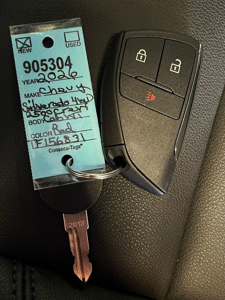 Red Hot 2026 Chevrolet Silverado 2500HD Work Truck 4WD 10-Speed Automatic 6.6L V8 10-Speed Automatic, 4WD, Jet Black Vinyl, 120-Volt Interior Power Outlet, 17 Machined Aluminum Wheels, 170 Amp Alternator, 2-Speed Electronic Shift Transfer Case, 220 Amp Alternator, 3.5 Diagonal Monochromatic Display DIC, 3.73 Rear Axle Ratio, 4-Wheel Disc Brakes, 6 Speakers, 6-Speaker Audio System, 720 Cold-Cranking Amps Heavy-Duty Battery, ABS brakes, Air Conditioning, AM/FM radio, Apple CarPlay/Android Auto, Auto High-beam Headlights, Black Front Bumper, Black Mirror Caps, Black Rear Bumper, Bluetooth For Phone, Brake assist, Chevrolet Connected Access Capable, Chrome Front Bumper, Compass, Deep-Tinted Glass, Delay-off headlights, Driver door bin, Dual front impact airbags, Dual front side impact airbags, Durabed Pickup Bed, Electric Rear-Window Defogger, Electronic Cruise Control with Set and Resume Speed, Electronic Stability Control, Emergency communication system: OnStar, EZ Lift Power Lock and Release Tailgate, Front 40/20/40 Split-Bench Seats with Lockable Storage, Front anti-roll bar, Front Center Armrest w/Storage, Front License Plate Kit, Front reading lights, Front wheel independent suspension, Fully automatic headlights, HD Rear Vision Camera, Heated Vertical Trailering Mirrors, High-Visibility Vertical Trailering Mirrors, Illuminated entry, LED Smoked Amber Roof Marker Lamps, Locking Tailgate, Low tire pressure warning, Manual Tailgate Function with No EZ Lift, Manual Tilt-Wheel Steering Column, Occupant sensing airbag, OnStar Services Capable, Outside temperature display, Overhead airbag, Overhead console, Panic alarm, Passenger door bin, Passenger vanity mirror, Power Door Locks, Power Front Windows with Driver Express Up/Down, Power Rear Windows with Express Down, Power steering, Power windows, Preferred Equipment Group 1WT, Premium audio system: Chevrolet Infotainment 3, Push Button Start, Radio: Chevrolet Infotainment 3 System, Rear 60/40 Folding Bench Seat (folds Up), Rear reading lights, Rear step bumper, Remote Keyless Entry, Remote keyless entry, Rubberized-Vinyl Floor Covering, SiriusXM Trial Subscription, Snow Plow Prep/Camper Package, Solar Absorbing Tinted Glass, Speed control, Split folding rear seat, Standard Tailgate, Suspension Package, Tachometer, Tilt steering wheel, Traction control, Trip computer, Upfitter Switch Kit (5), Variably intermittent wipers, Vinyl Seat Trim, Voltmeter, Wheels: 17 Silver Painted Steel, Wi-Fi Hotspot Capable, Wireless Phone Projection, WT Convenience Package, 10-Speed Automatic, 4WD, Jet Black Vinyl.