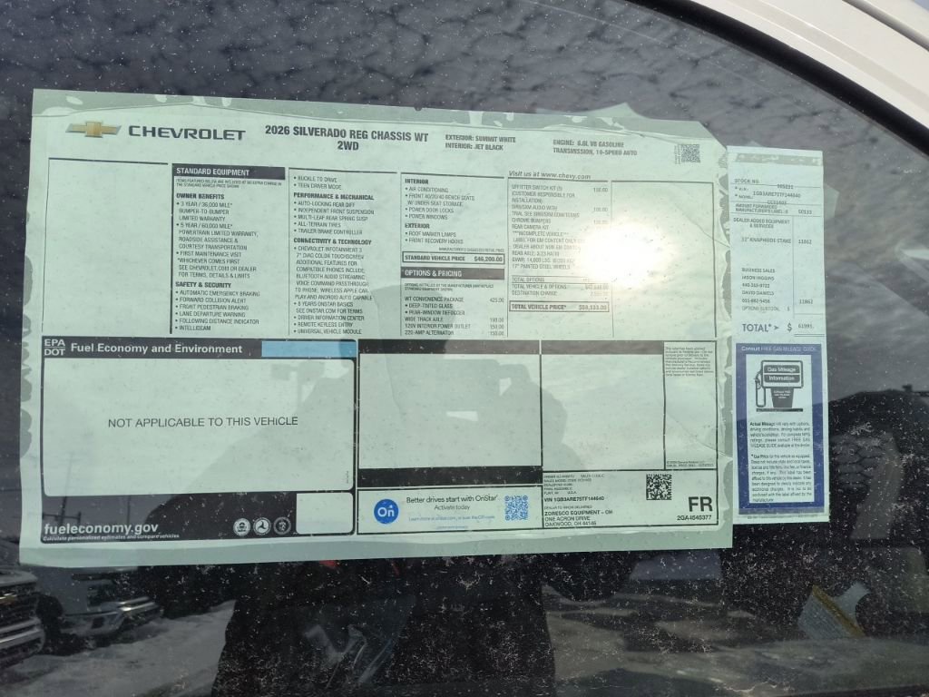 Summit White 2026 Chevrolet Silverado 3500HD Work Truck RWD 10-Speed Automatic 6.6L V8 10-Speed Automatic, Jet Black Vinyl, 120-Volt (400 Watts) Interior Power Outlet, 17 Painted Steel Wheels, 170 Amp Alternator, 2 Speakers, 2-Speaker Audio System Feature, 220 Amp Alternator, 3.5 Diagonal Monochromatic Display DIC, 4-Way Manual Driver Seat Adjuster, 4-Way Manual Passenger Seat Adjuster, 4-Wheel Disc Brakes, ABS brakes, Air Conditioning, AM/FM radio, Auto High-beam Headlights, Black Front Bumper, Black Mirror Caps, Bluetooth For Phone, Brake assist, Compass, Compass Located in Instrument Cluster, Deep-Tinted Glass, Delay-off headlights, Driver door bin, Dual front impact airbags, Dual front side impact airbags, Dual rear wheels, Electric Rear-Window Defogger, Electronic Stability Control, Emergency communication system, Front 40/20/40 Split-Bench Seat, Front anti-roll bar, Front Center Armrest w/Storage, Front Chrome Bumper, Front Grille Bar with Black Mesh Inserts, Front License Plate Kit, Front reading lights, Front wheel independent suspension, Fully automatic headlights, Heavy-Duty 80 Amp-Hour Battery, Illuminated entry, Low tire pressure warning, Manual Tilt Inside Rearview Mirror, Manual Tilt-Wheel Steering Column, Occupant sensing airbag, OnStar Services Capable, Outside temperature display, Overhead airbag, Overhead console, Panic alarm, Passenger door bin, Passenger vanity mirror, Power steering, Power windows, Preferred Equipment Group 1WT, Premium audio system: Chevrolet Infotainment System 3, Radio: Chevrolet Infotainment 3 System, Remote keyless entry, Rubberized-Vinyl Floor Covering, SiriusXM Trial Subscription, Solar Absorbing Tinted Glass, Speed control, Steering Wheel Mounted Electronic Cruise Control, Suspension Package, Tachometer, Tilt steering wheel, Traction control, Trip computer, Upfitter Switch Kit (5), Variably intermittent wipers, Vinyl Seat Trim, Voltmeter, WT Convenience Package, 10-Speed Automatic, Jet Black Vinyl.