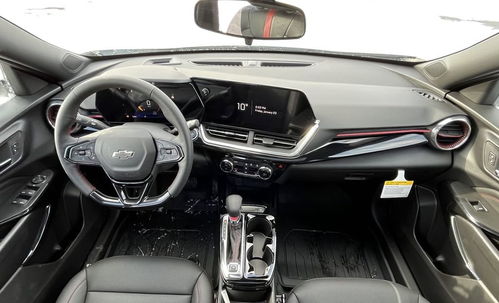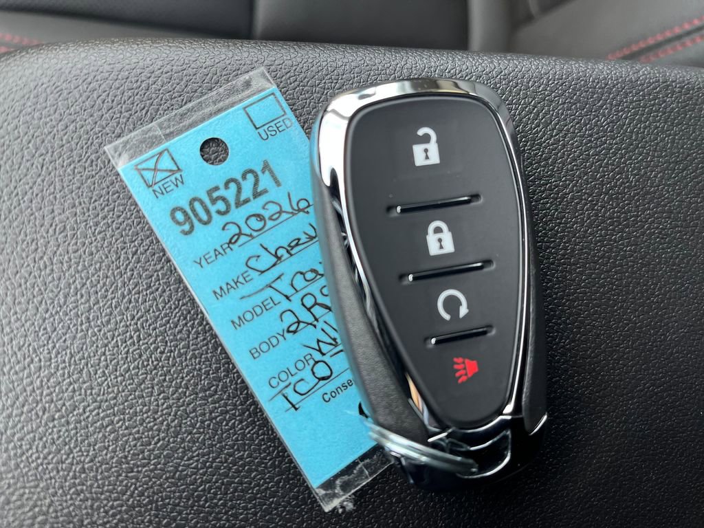 Summit White 2026 Chevrolet Trax 2RS FWD 6-Speed Automatic ECOTEC 1.2L Turbo 2-Way Adjustable Front Head Restraints, 2-Way Power Driver Lumbar Seat Adjuster, 3.50 Final Drive Axle Ratio, 4-Way Manual Front Passenger Seat Adjuster, 4-Wheel Disc Brakes, 6 Speakers, 6-Speaker Audio System Feature, 8-Way Power Driver Seat Adjuster, ABS brakes, Adaptive Cruise Control, Air Conditioning, Alloy wheels, AM/FM radio: SiriusXM, Auto High-beam Headlights, Automatic temperature control, Brake assist, Bumpers: body-color, Compass, Delay-off headlights, Driver Confidence Package, Driver door bin, Driver vanity mirror, Dual front impact airbags, Dual front side impact airbags, Electronic Stability Control, Emergency communication system: OnStar One Essentials, Evotex Seat Trim, Exterior Parking Camera Rear, Front and Rear Jet Black All-Weather Floor Liners, Front anti-roll bar, Front Bucket Seats, Front Center Armrest, Front reading lights, Front wheel independent suspension, Fully automatic headlights, Heated door mirrors, Heated Driver and Front Passenger Seats, Heated front seats, Heated steering wheel, Illuminated entry, Lane Change Alert with Side Blind Zone Alert, Leather steering wheel, Low tire pressure warning, Occupant sensing airbag, Outside temperature display, Overhead airbag, Overhead console, Panic alarm, Passenger door bin, Passenger vanity mirror, Power door mirrors, Power driver seat, Power Sliding Glass Sunroof with Manual Shade, Power steering, Power windows, Preferred Equipment Group 2RS, Premium audio system: Chevrolet Infotainment 3, Radio data system, Radio: AM/FM Stereo Audio System, Rear Cross Traffic Alert, Rear Park Assist, Rear window defroster, Rear window wiper, Remote keyless entry, Security system, SiriusXM Trial Subscription, Speed control, Split folding rear seat, Spoiler, Sport steering wheel, Steering wheel mounted audio controls, Sunroof Package, Tachometer, Telescoping steering wheel, Tilt steering wheel, Traction control, Trip computer, Variably intermittent wipers, Wheels: 19 Black-Painted Machined Aluminum, Wireless Apple CarPlay/Wireless Android Auto, Wireless Charging.