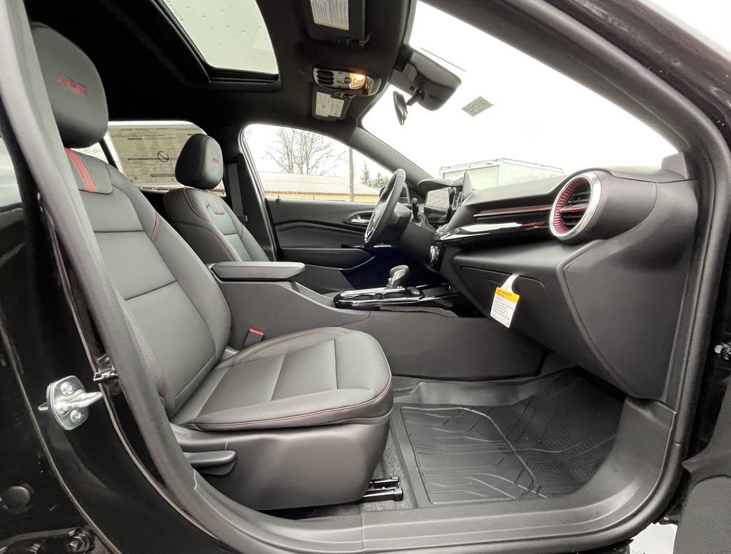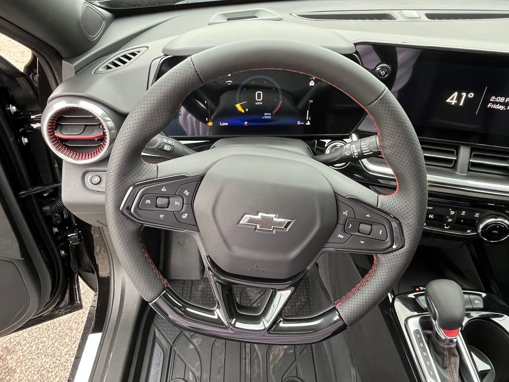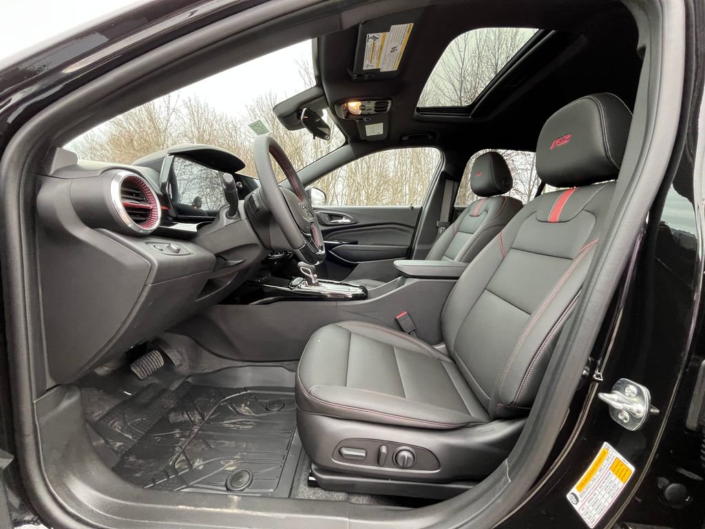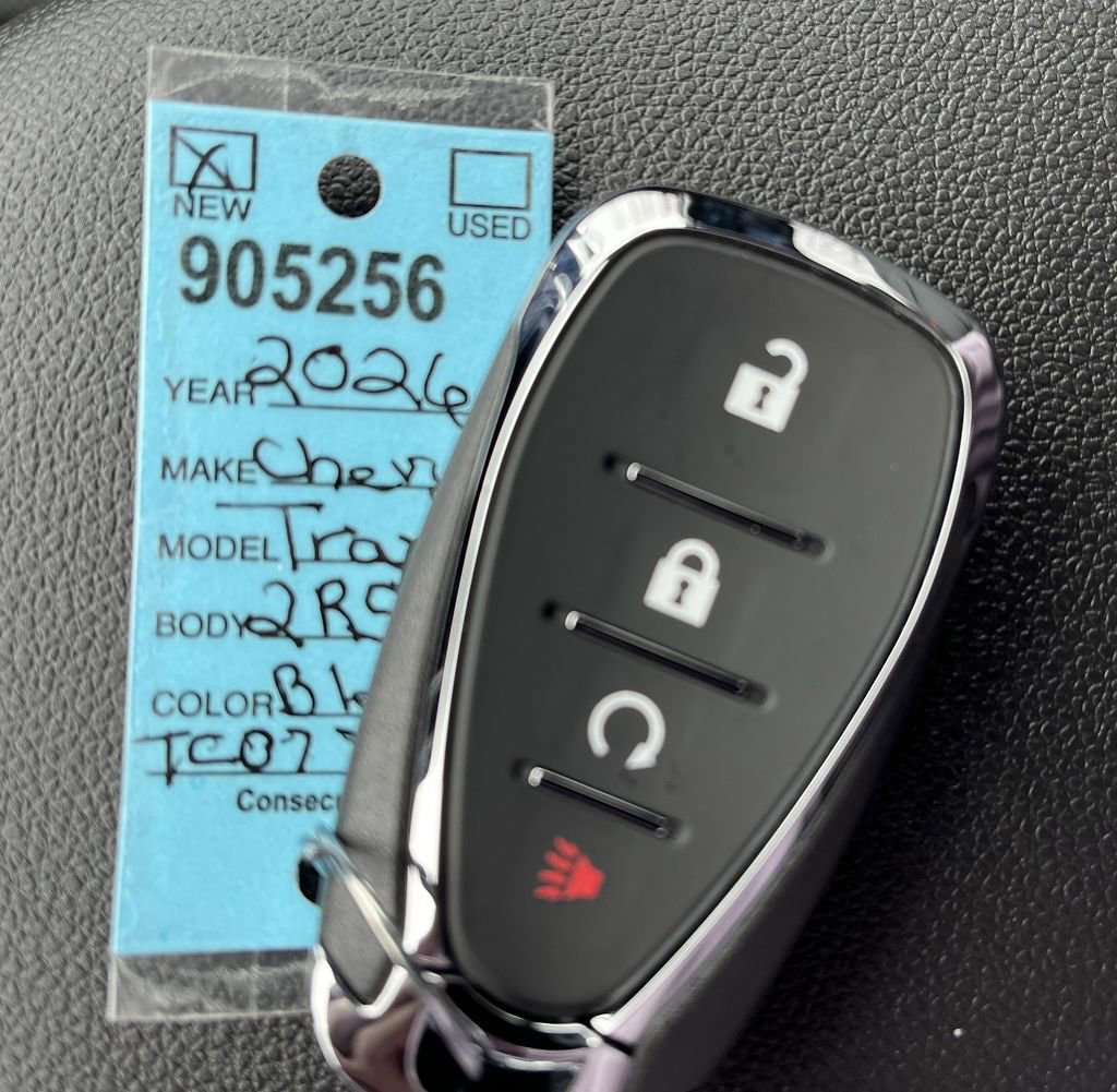 Black 2026 Chevrolet Trax 2RS FWD 6-Speed Automatic ECOTEC 1.2L Turbo 2-Way Adjustable Front Head Restraints, 2-Way Power Driver Lumbar Seat Adjuster, 3.50 Final Drive Axle Ratio, 4-Way Manual Front Passenger Seat Adjuster, 4-Wheel Disc Brakes, 6 Speakers, 6-Speaker Audio System Feature, 8-Way Power Driver Seat Adjuster, ABS brakes, Air Conditioning, Alloy wheels, AM/FM radio: SiriusXM, Auto High-beam Headlights, Automatic temperature control, Brake assist, Bumpers: body-color, Compass, Delay-off headlights, Driver door bin, Driver vanity mirror, Dual front impact airbags, Dual front side impact airbags, Electronic Stability Control, Emergency communication system: OnStar One Essentials, Evotex Seat Trim, Exterior Parking Camera Rear, Front anti-roll bar, Front Bucket Seats, Front Center Armrest, Front reading lights, Front wheel independent suspension, Fully automatic headlights, Heated door mirrors, Heated Driver and Front Passenger Seats, Heated front seats, Heated steering wheel, Illuminated entry, Leather steering wheel, Low tire pressure warning, Occupant sensing airbag, Outside temperature display, Overhead airbag, Overhead console, Panic alarm, Passenger door bin, Passenger vanity mirror, Power door mirrors, Power driver seat, Power steering, Power windows, Premium audio system: Chevrolet Infotainment 3, Radio data system, Radio: AM/FM Stereo Audio System, Rear window defroster, Rear window wiper, Remote keyless entry, Security system, SiriusXM Trial Subscription, Speed control, Split folding rear seat, Spoiler, Sport steering wheel, Steering wheel mounted audio controls, Tachometer, Telescoping steering wheel, Tilt steering wheel, Traction control, Trip computer, Variably intermittent wipers, Wheels: 19 Black-Painted Machined Aluminum, Wireless Apple CarPlay/Wireless Android Auto.