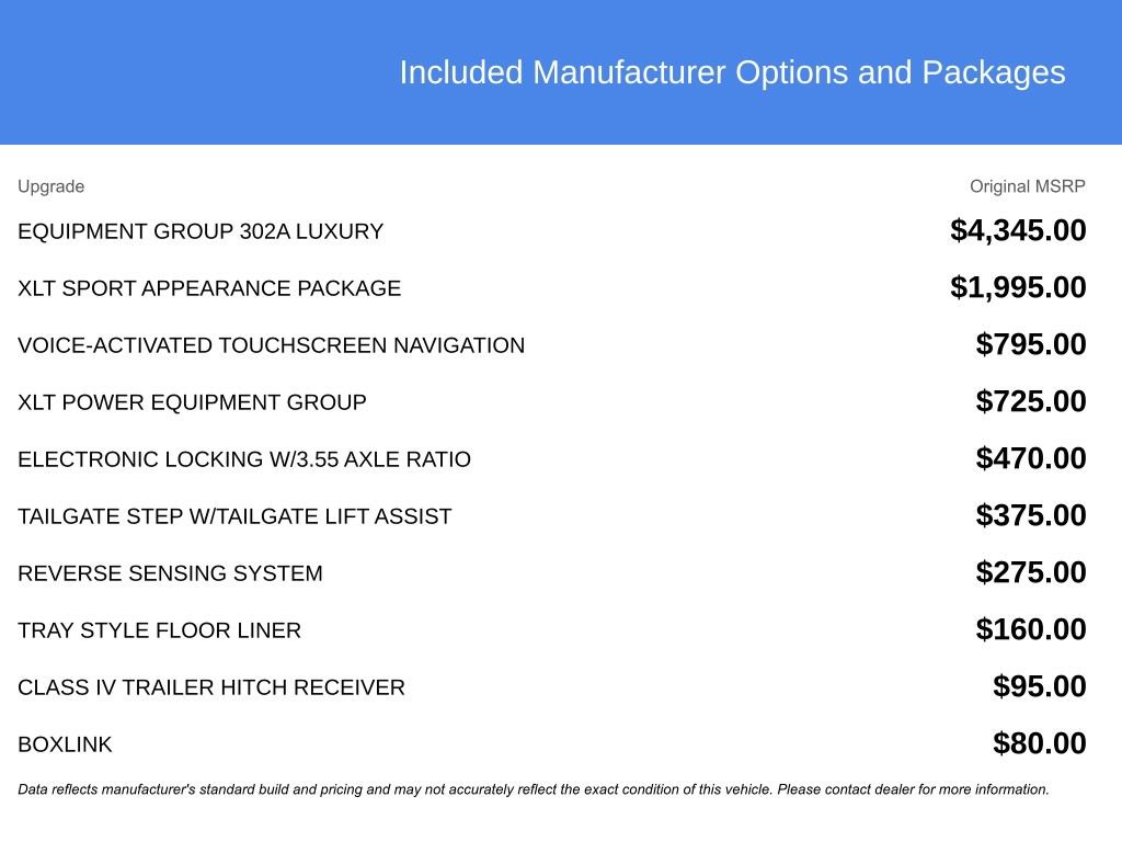 4WD, 110V/400W Outlet, 2-Bar Style Grille w/2 Minor Bars Painted Dark, 2-Bar Style Grille w/Chrome 2 Minor Bars, 3.73 Axle Ratio, 4-Wheel Disc Brakes, 4.2 Productivity Screen in Instrument Cluster, 6 Speakers, 8-Way Power Driver Seat, ABS brakes, Accent-Color Step Bars, Air Conditioning, Alloy wheels, AM/FM radio, AppLink/Apple CarPlay and Android Auto, Auto High-beam Headlights, Auto-Dimming Rear-View Mirror, Body-Color Door & Tailgate Handles, Body-Color Front & Rear Bumpers, Box Side Decals, BoxLink, Brake assist, Bumpers: chrome, Chrome Door & Tailgate Handles w/Body-Color Bezel, Chrome Step Bars, Class IV Trailer Hitch Receiver, Cloth 40/20/40 Front Seat, Compass, Delay-off headlights, Driver door bin, Driver vanity mirror, Dual front impact airbags, Dual front side impact airbags, Electronic Stability Control, Emergency communication system: SYNC 3 911 Assist, Equipment Group 302A Luxury, Exterior Parking Camera Rear, Fixed Backlight w/Privacy Glass, Front anti-roll bar, Front Center Armrest w/Storage, Front fog lights, Front wheel independent suspension, Fully automatic headlights, GVWR: 6,500 lbs Payload Package, Heated Front Seats, Illuminated entry, Leather-Wrapped Steering Wheel, LED Box Lighting, Low tire pressure warning, Occupant sensing airbag, Outside temperature display, Overhead airbag, Panic alarm, Passenger door bin, Passenger vanity mirror, Power door mirrors, Power Glass Heated Sideview Mirrors, Power steering, Power windows, Power-Adjustable Pedals, Power-Sliding Rear Window, Radio data system, Radio: AM/FM Stereo w/6 Speakers, Rear step bumper, Rear Under-Seat Storage, Rear Window Defroster, Remote keyless entry, Remote Start System, Reverse Sensing System, Security system, Single-Tip Chrome Exhaust, SiriusXM Radio, Speed control, Speed-sensing steering, Split folding rear seat, Steering wheel mounted audio controls, SYNC 3, Tachometer, Tailgate Step w/Tailgate Lift Assist, Telescoping steering wheel, Tilt steering wheel, Traction control, Tray Style Floor Liner, Variably intermittent wipers, Voice-Activated Touchscreen Navigation, Voltmeter, Wheels: 17 Silver Painted Aluminum, Wheels: 18 6-Spoke Machined-Aluminum, Wheels: 18 Chrome-Like PVD, XLT Chrome Appearance Package, XLT Power Equipment Group, XLT Sport Appearance Package, 4WD.