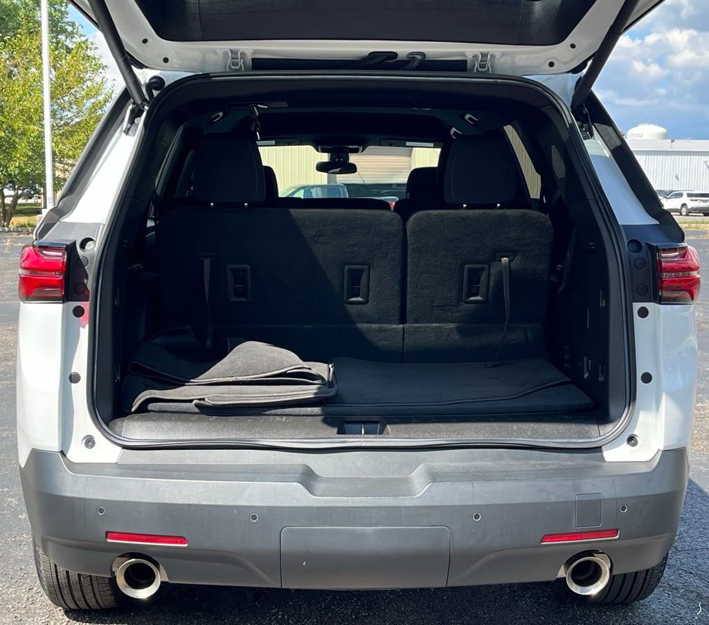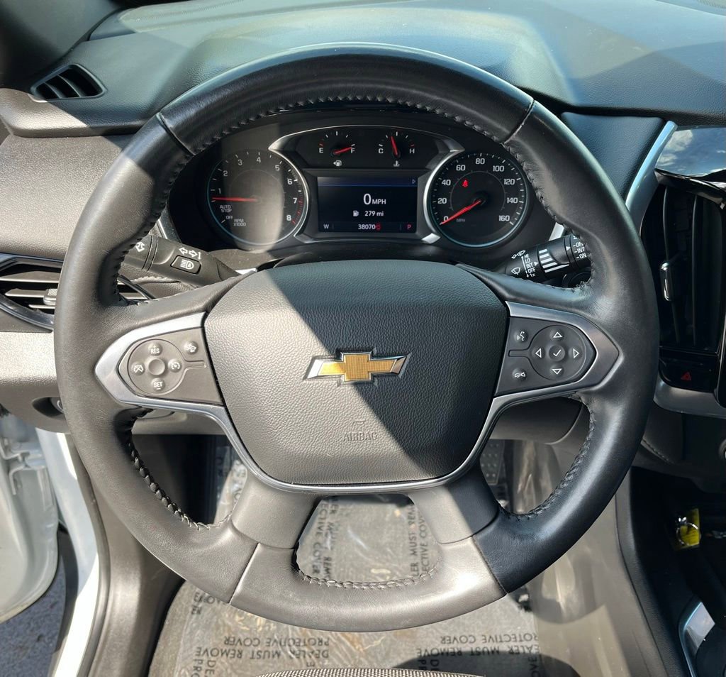 AWD, 2-Way Manual Front Passenger Seat Adjuster, 3.49 Axle Ratio, 3rd row seats: split-bench, 4-Wheel Disc Brakes, 6 Speakers, 6-Speaker Audio System Feature, 8-Passenger Seating (2-3-3 Seating Configuration), 8-Way Power Driver Seat Adjuster, ABS brakes, Air Conditioning, Alloy wheels, AM/FM radio: SiriusXM, Apple CarPlay/Android Auto, Auto High-beam Headlights, Automatic temperature control, Black Roof Rails, Brake assist, Bumpers: body-color, Compass, Delay-off headlights, Driver door bin, Driver vanity mirror, Dual front impact airbags, Dual front side impact airbags, Electronic Stability Control, Emergency communication system: OnStar Guidance, Exterior Parking Camera Rear, Four wheel independent suspension, Front anti-roll bar, Front Bucket Seats, Front Center Armrest, Front dual zone A/C, Front License Plate Bracket Mounting Package, Front reading lights, Fully automatic headlights, Garage door transmitter, Heated door mirrors, Heated Driver & Front Passenger Seats, Heated front seats, Illuminated entry, Leather steering wheel, Low tire pressure warning, Not Equipped w/Rear Park Assist, Occupant sensing airbag, Outside temperature display, Overhead airbag, Overhead console, Panic alarm, Passenger door bin, Passenger vanity mirror, Power door mirrors, Power Driver Lumbar Control, Power driver seat, Power Liftgate, Power steering, Power windows, Preferred Equipment Group 1LT, Premium Cloth Seat Trim, Radio data system, Radio: Chevrolet Infotainment 3 Plus System, Rear air conditioning, Rear anti-roll bar, Rear Park Assist w/Audible Warning, Rear reading lights, Rear window defroster, Rear window wiper, Remote keyless entry, Roof rack: rails only, Security system, SiriusXM w/360L, Speed control, Speed-sensing steering, Spoiler, Steering wheel mounted audio controls, Tachometer, Telescoping steering wheel, Tilt steering wheel, Traction control, Trip computer, Turn signal indicator mirrors, Variably intermittent wipers, Voltmeter, Wheels: 18 Bright Silver-Painted Aluminum, AWD.