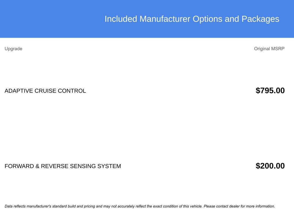 Prices do not include additional fees and costs of closing, including government fees and taxes, any finance charges, any dealer documentation fees, any emissions testing fees or other fees. All prices, specifications and availability subject to change without notice. Contact dealer for most current information. Prices are valid thru the close of business, today only.